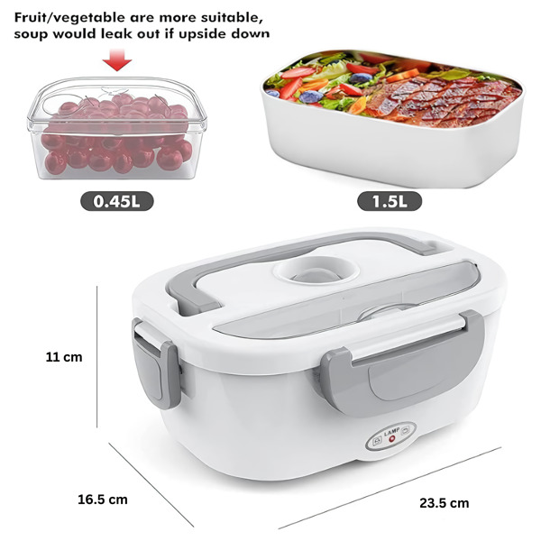 Tato ohřívaná nádoba na oběd obsahuje dvě vyjímatelné nádoby o objemu 1,5 l a plastovou nádobu o objemu 0,45 l, které lze používat střídavě.